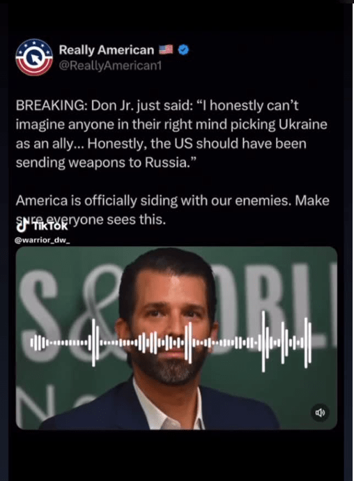 It is common to hear in the modern media landscape outrageous assertions. A recent post on social media contained an audio clip that claimed Donald Trump Jr. was in favor of delivering weapons to Russia rather than Ukraine. The statement itself immediately caught my attention as one I needed to research, not only because it was controversial, but because it had a few red flags.