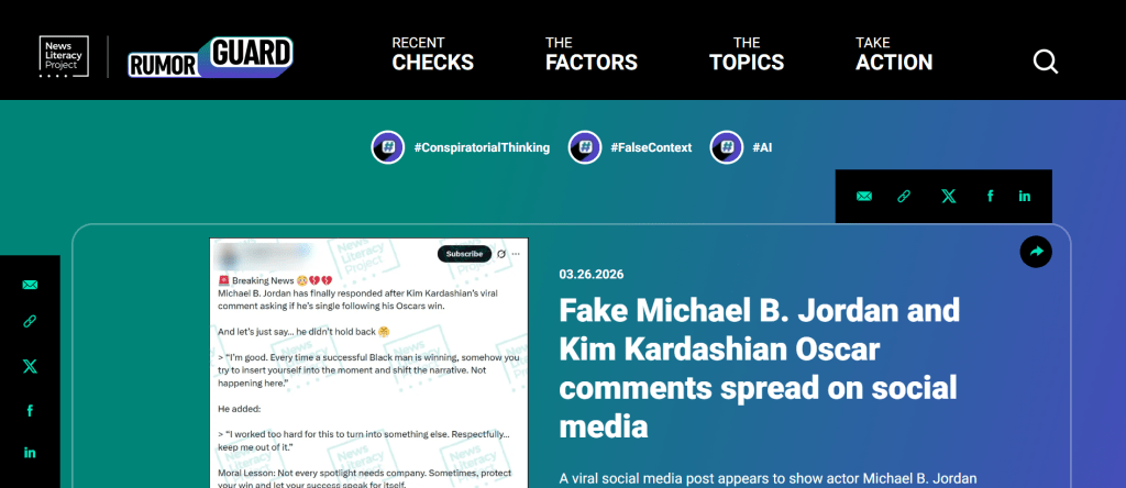 RumorGuard is a web-based application created by the News Literacy Project that allows users to analyze viral posts, images, and news articles. It acts as a fact-check encyclopedia, with each post disaggregating the veracity of a claim as true, false, or misleading. The site has a uniform structure. This includes locating sources, verifying evidence, and analyzing background, which will help users to navigate the verification process.